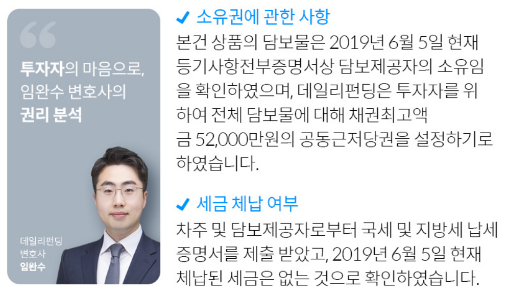 데일리 펀딩은 변호사가 직접 권리분석을 하여 투자자에게 보고서를 제공한다