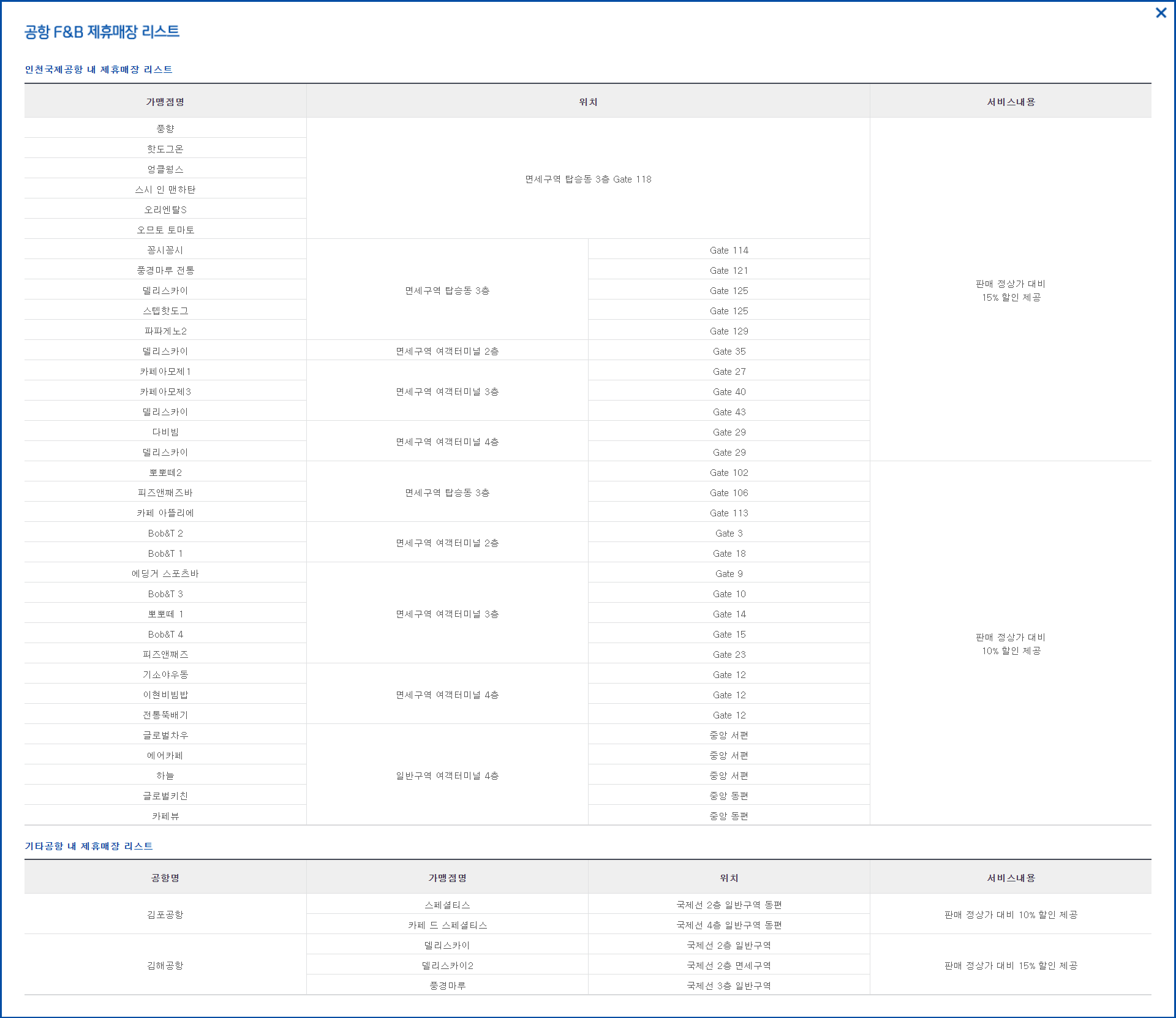 - 공항 내 주요 레스토랑 10% 현장 할인
