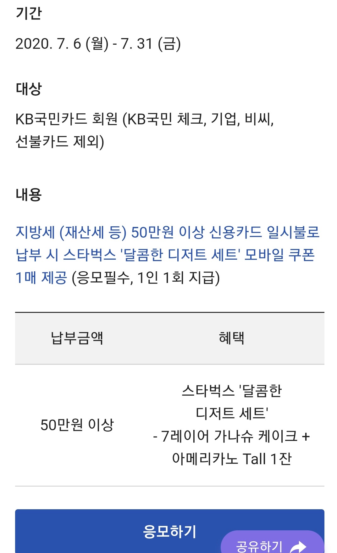 KB국민카드 앱에 들어가서(메인 페이지에 떠있음 20/7/14기준) '응모하기'버튼을 누른 후