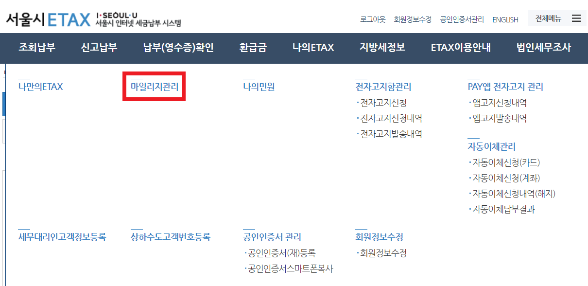 1) 나의 ETAX -> 마일리지관리를 클릭한 후