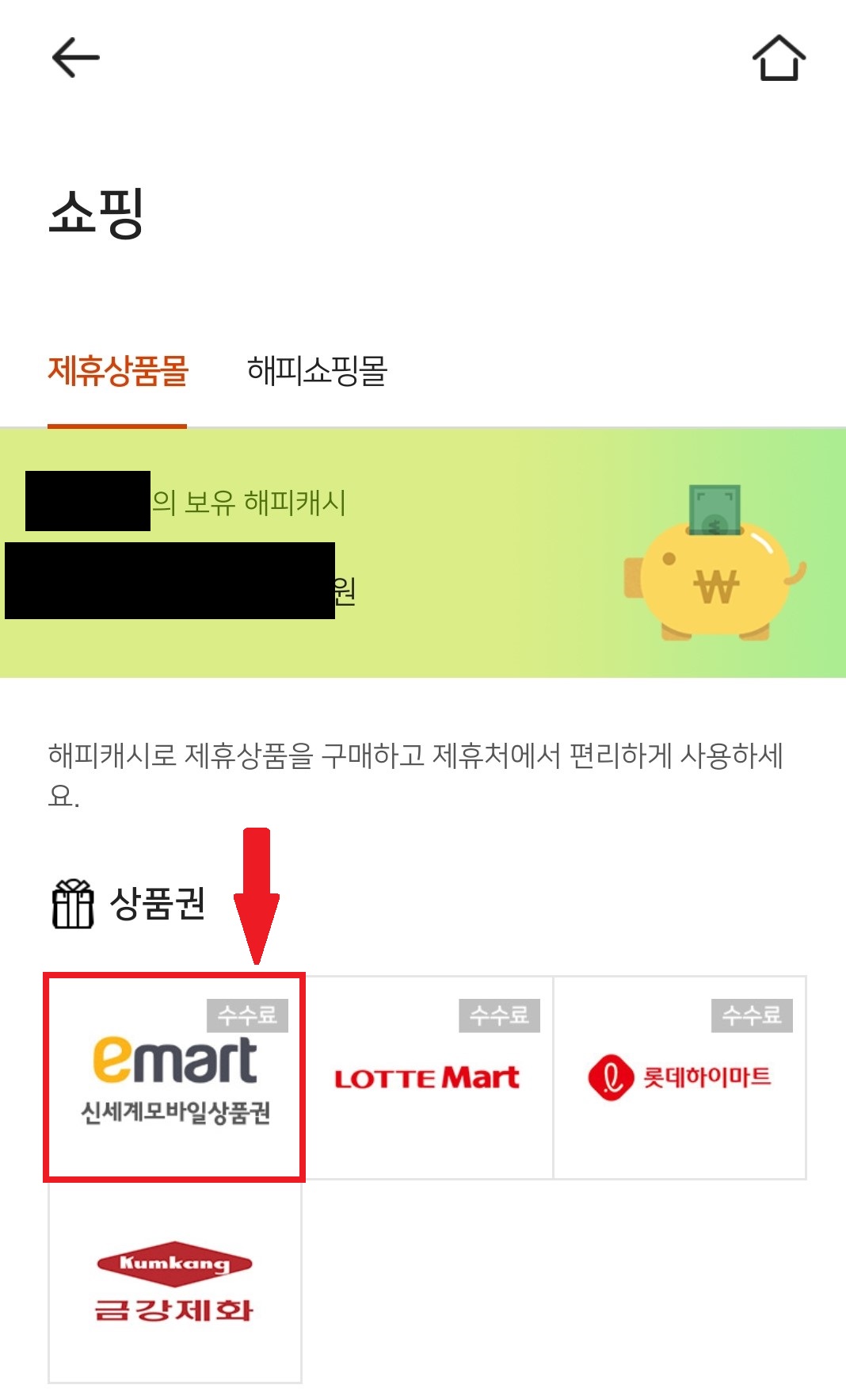 해피머니 앱 -> 캐시충전 -> 해피머니 상품권으로 들어가서