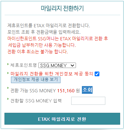 2) SSG MONEY를 ETAX 마일리지로 전환하자