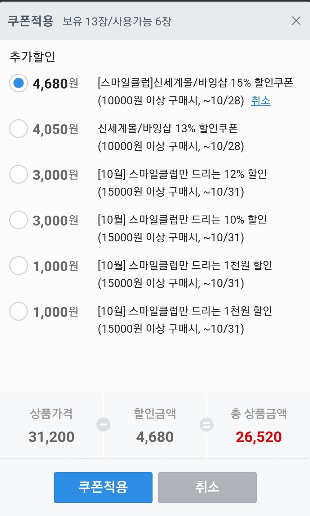 봄봄쿠폰 15% 적용하여 26,520에 구매완료