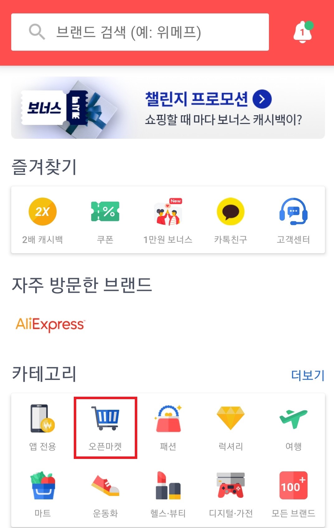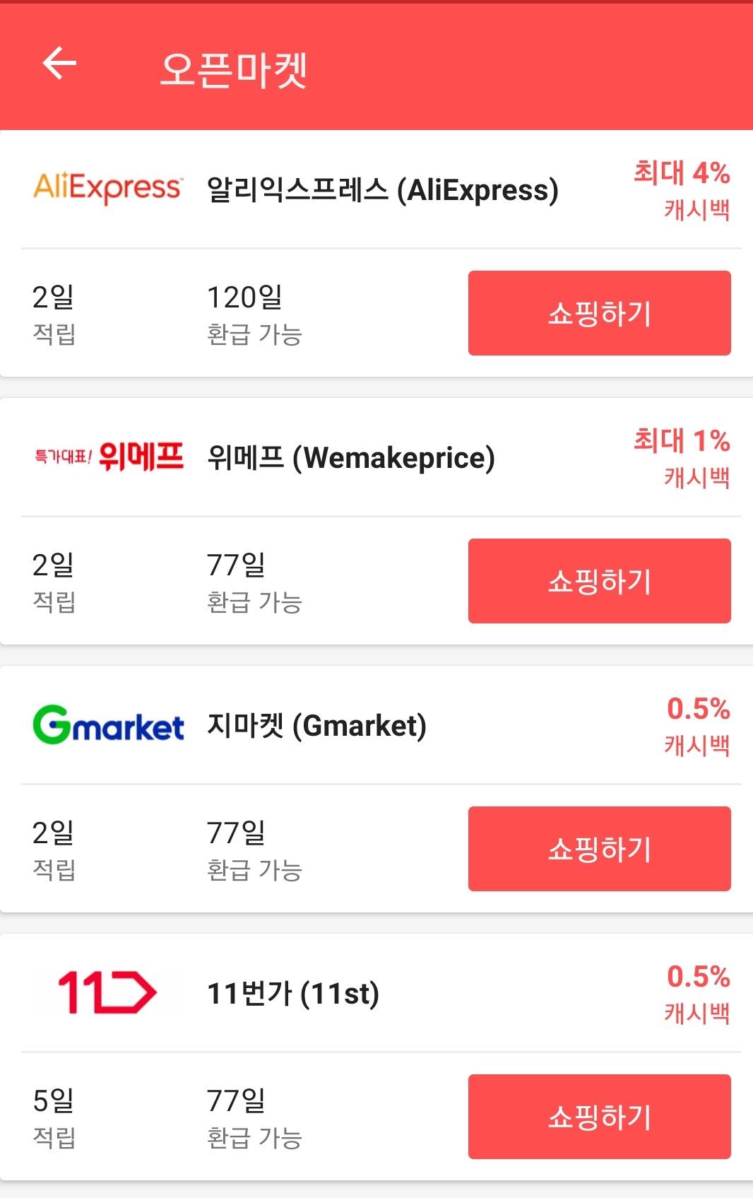 샵백 앱에 들어가서 -> 오픈마켓 버튼을 터치하면