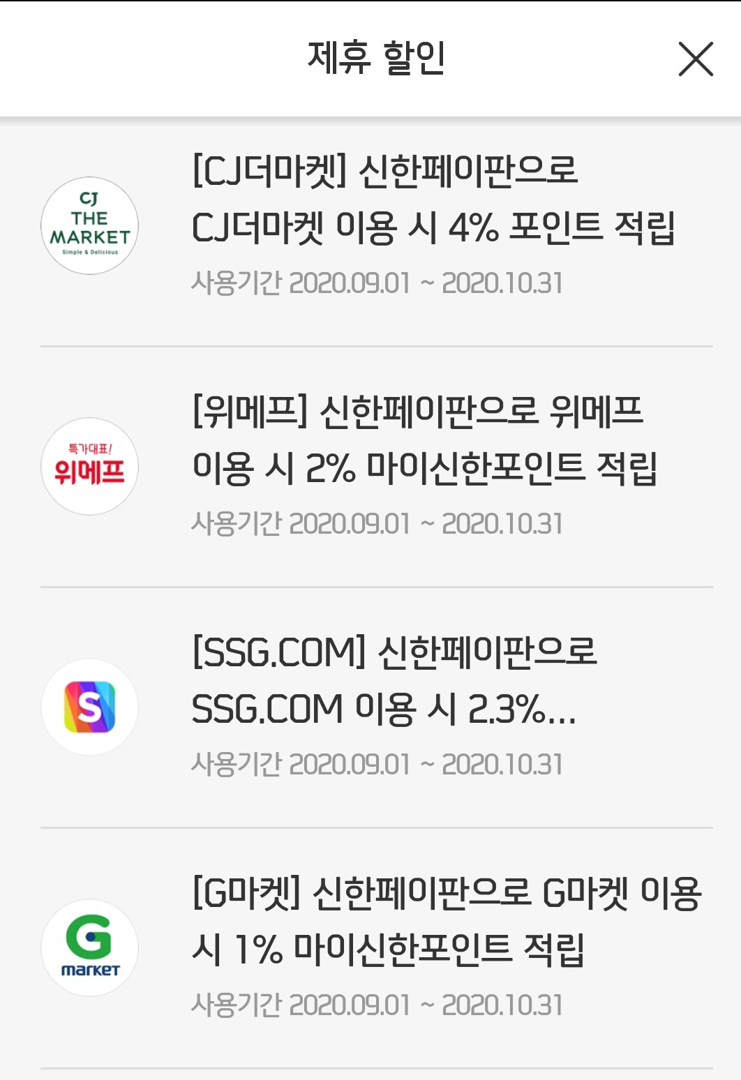 신한페이판 앱 -> 메뉴 -> 혜택 -> 진행중 이벤트 -> 제휴할인으로 들어가서