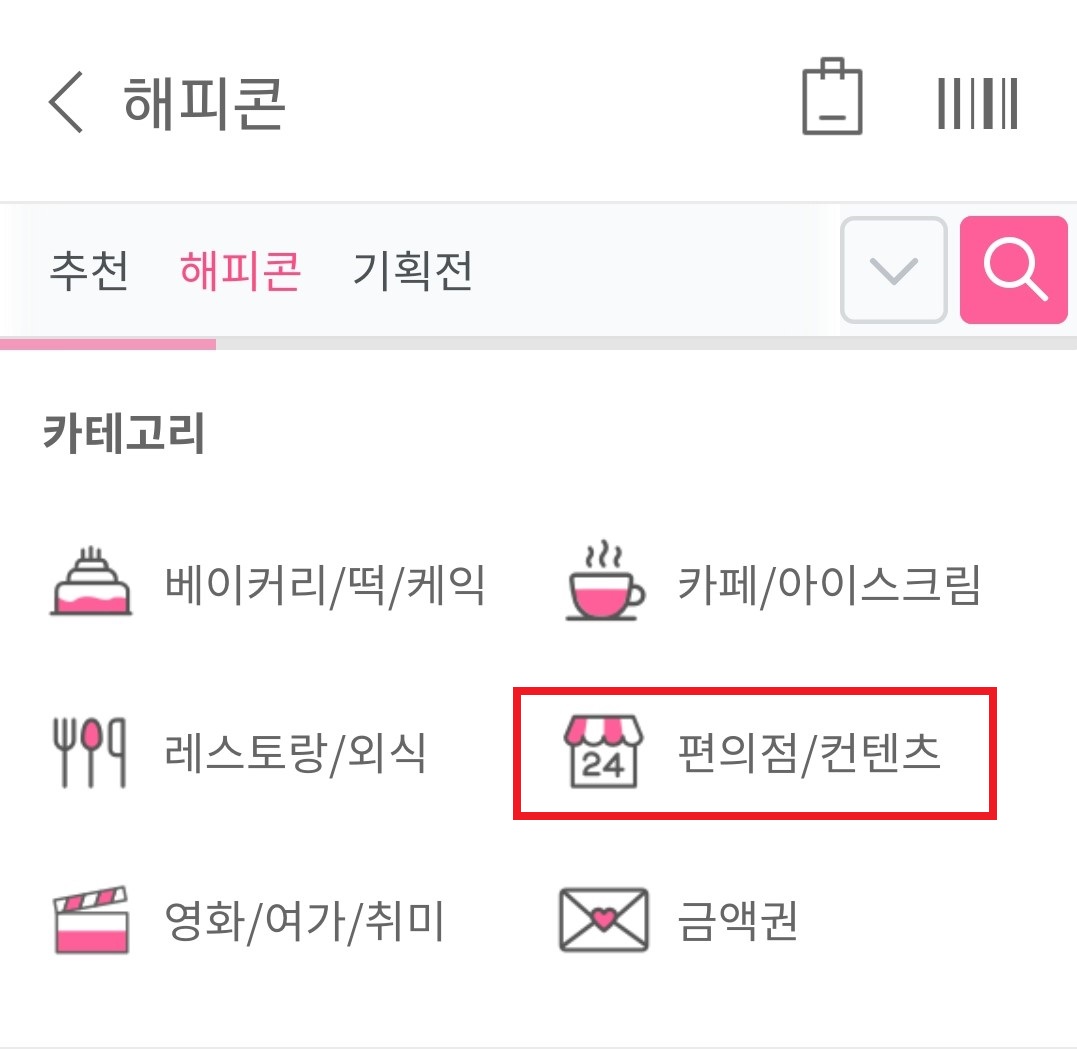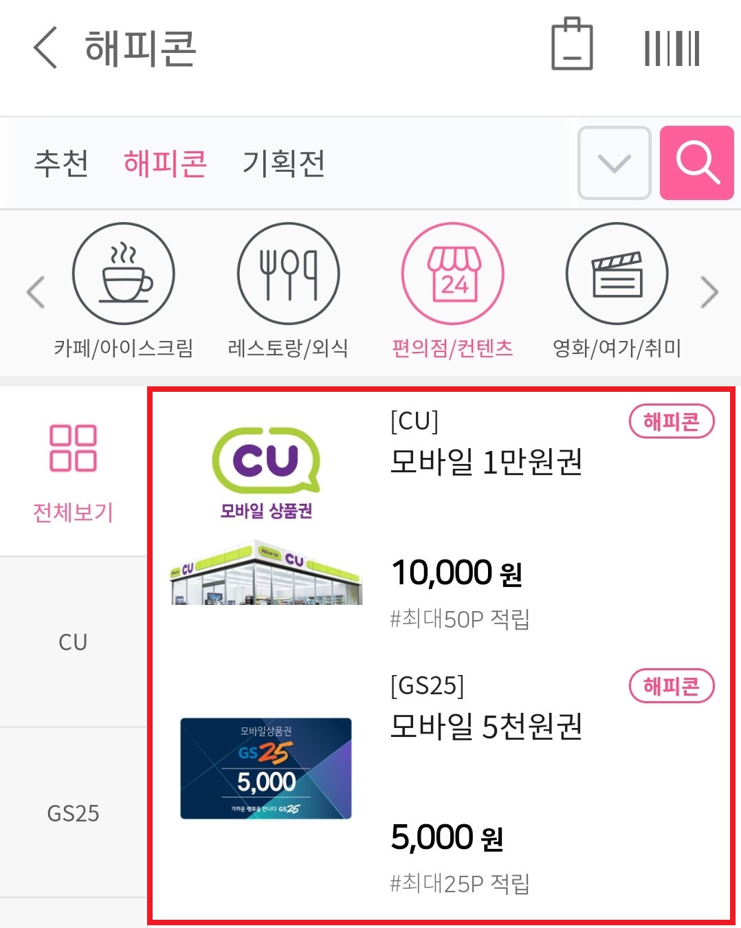 해피포인트 앱 -> 해피마켓 -> 해피콘 -> 금액권 구매(GS편의점 상품권 추천)
