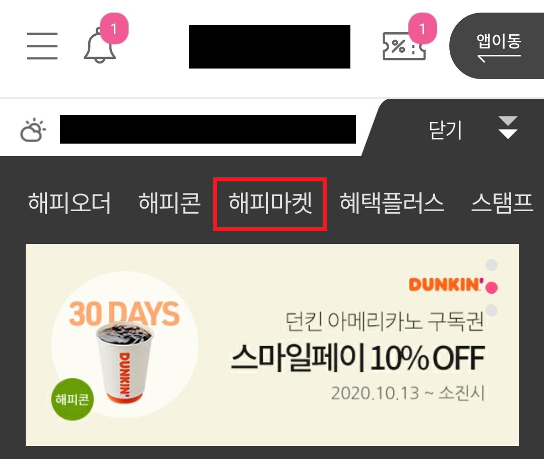 해피포인트 앱을 연다 -> 해피마켓 탭을 터치한다