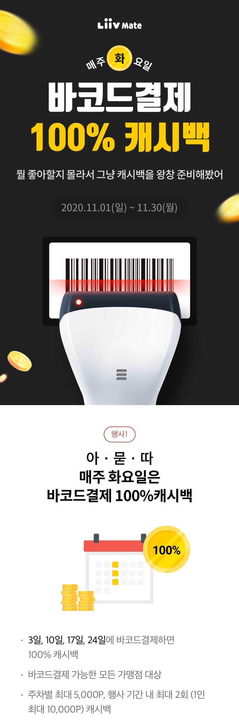 이 바코드 결제를 이용하여 결제를 하면 5,000원 까지 캐시백을 해준다.