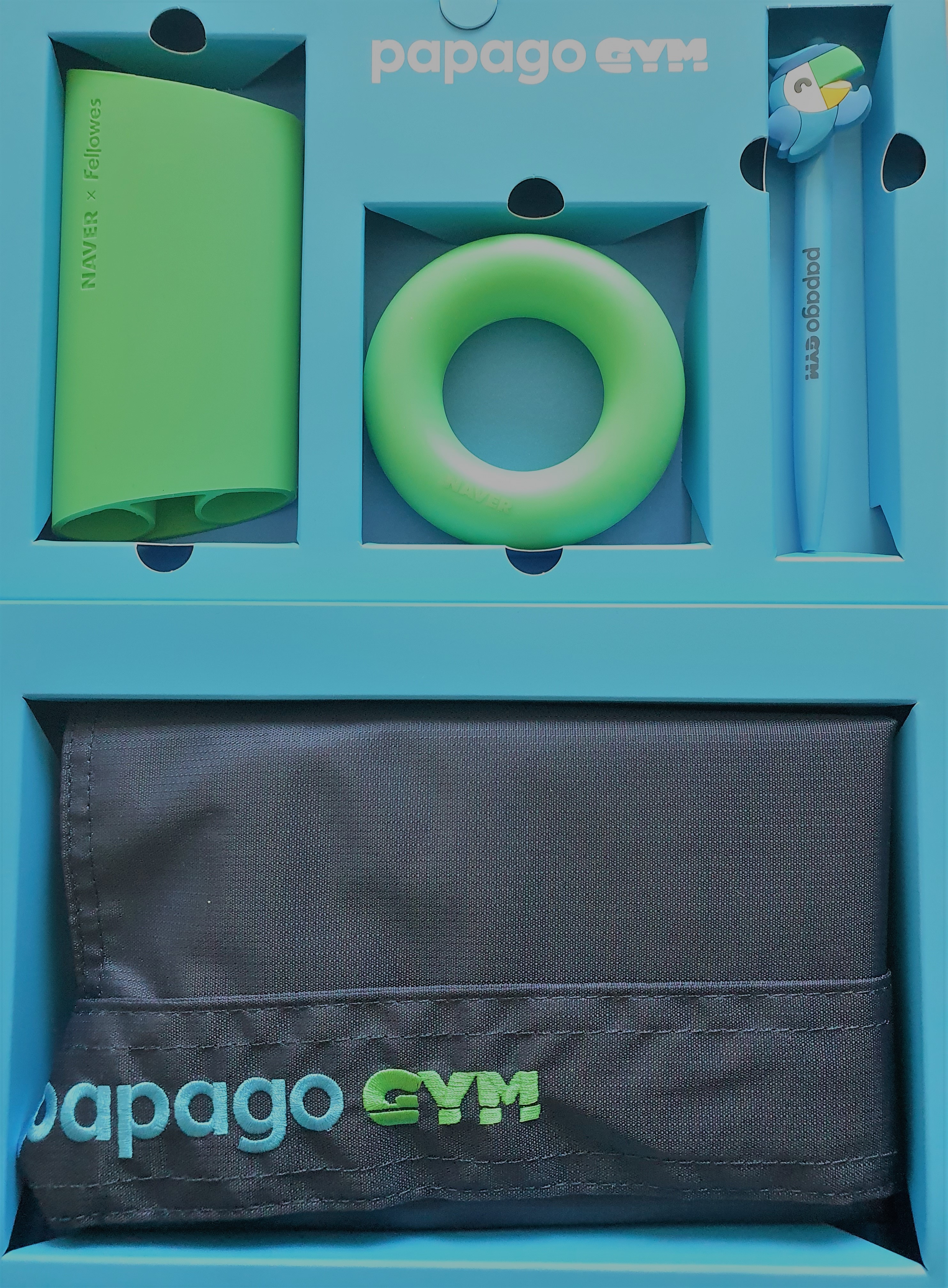 상품은 파파고 손목 받침대(마우스용), 파파고 손목운동기(도넛처럼생긴 것), 파파고 볼펜, 파파고 에코백이다.