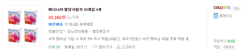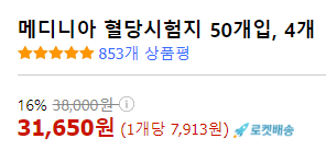 (참고: 메디니아 혈당시험지 1통(50매) 네이버/다나와 최저가는 9,000원~10,000원 정도다.)
