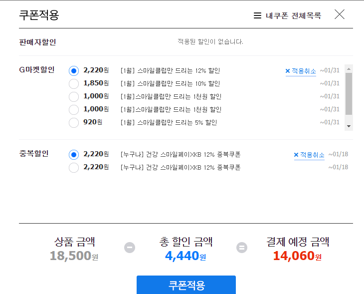 [누구나] 건강 스마일페이KB 12% 중복쿠폰 할인: -2,220원