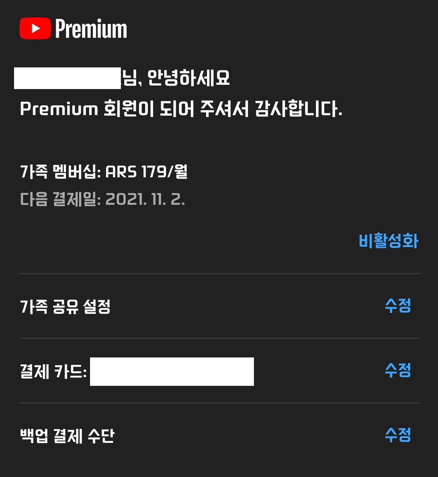 아르헨티나 유튜브 프리미엄이 저렴한데다가 가족계정까지 만들 수 있다고 해서