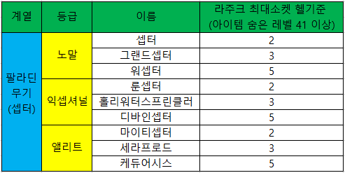 -> 팔라딘(=성기사) 전용 주무기 콜투암스(5솟), 인내(4솟) 재료
