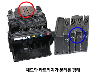 일체형 카트리지는 위 사진 빨간 동그라미 부분과 같이 '간이 헤드'가 카트리지에 붙어있다.