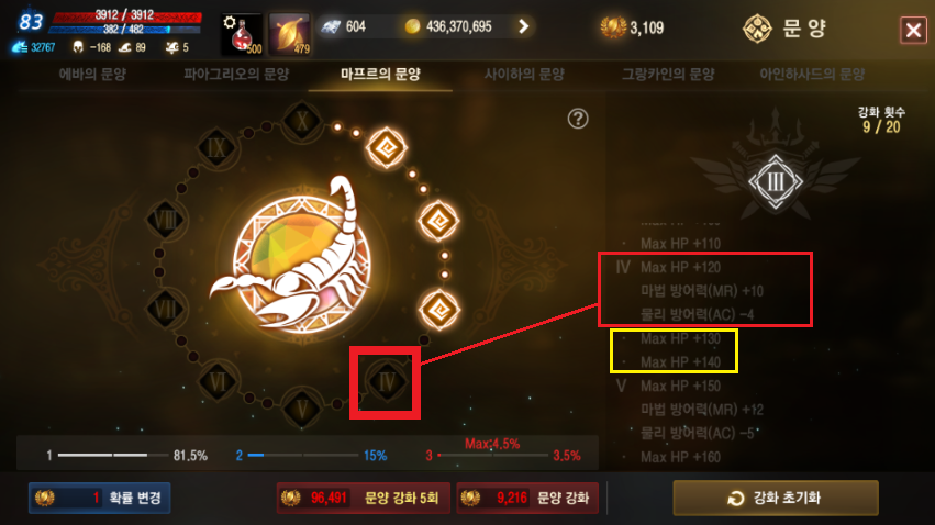 첫 문양강화 5회연속(축복포인트 640소모) 해서 8~9칸 나오면 성공이다.
