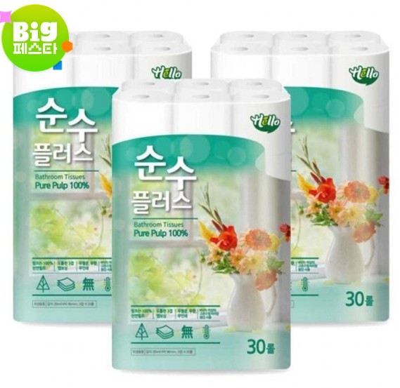 헬로 순수 3겹 천연펄프 화장지 30m 30롤 3팩 구매했다.(2023/04/08)