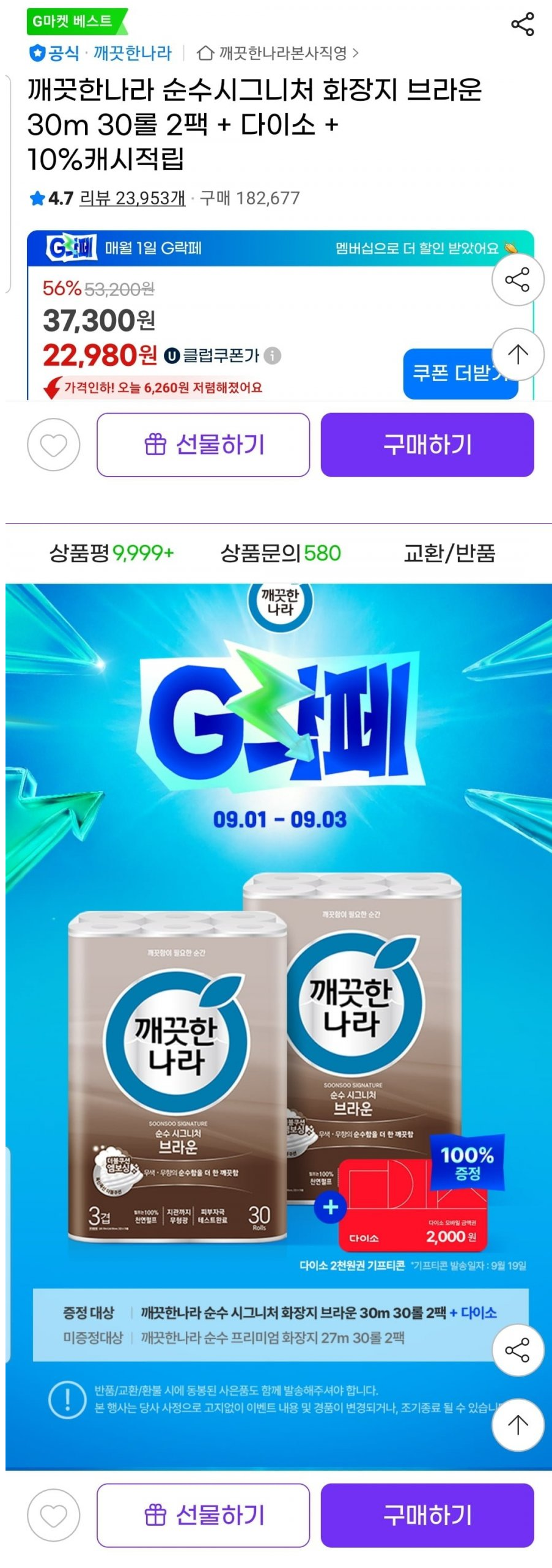 깨끗한나라 순수 시그니처 브라운 화장지 30m*30롤*2팩: 22,980원.
