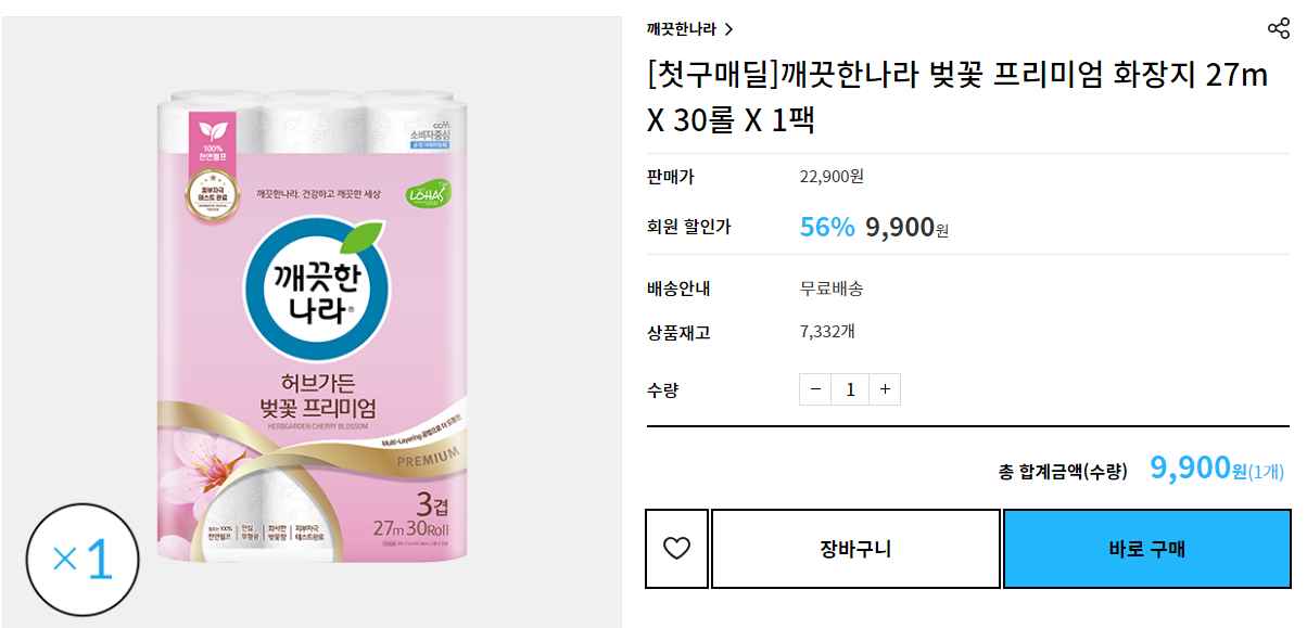 깨끗한나라 벚꽃 프리미엄 화장지 27m*30롤*1팩[첫구매딜]: 9,900원