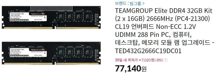 TEAMGROUP Elite DDR4 32GB Kit (2*16GB): 77,140원