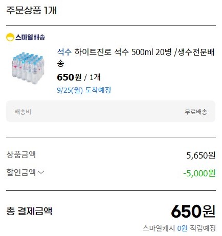 진로 석수 500ml*20병 쿠폰 사용하여 650원에 샀다.
