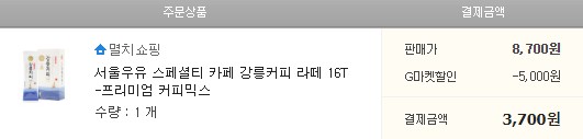 강릉커피라떼(커피믹스) 16T 쿠폰 사용하여 3,700원에 샀다. (1T에 231.25원 꼴)